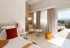 Ouvert sur la grande terrasse et le panorama des jardins, ce cadre élégant vous plonge dans une ambiance douce et apaisante.